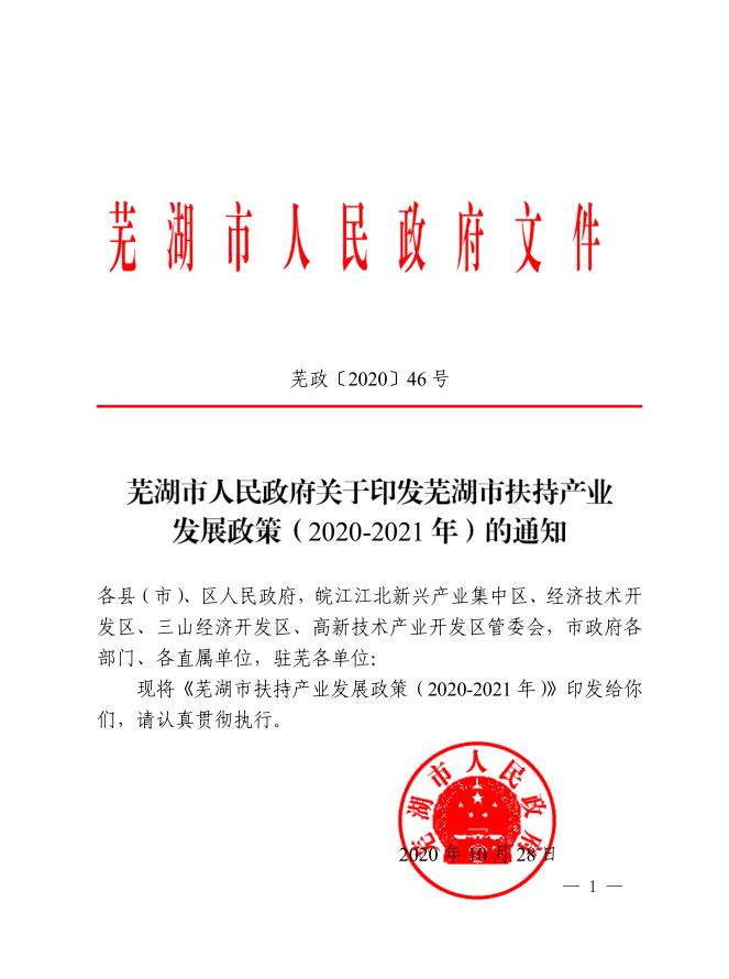 蕪湖市人民政府關于印發(fā)蕪湖市扶持產(chǎn)業(yè)發(fā)展政策(2020-2021年)的通知